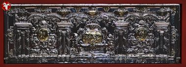 Realizado por Juan Sanz en 1759, este FRONTAL DE ALTAR de plata se encuentra dividido en tres partes separadas por columnas y cubiertas con medallones con temas referidos a la santa Cruz, rodeados por ángeles que portan los símbolos de la Pasión.