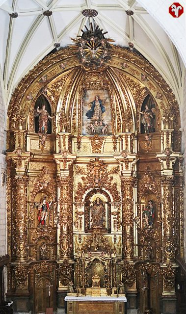 Terminado en 1742 por el maestro ensamblador Pedro de Correas, con taller en Valladolid. Presenta forma de cascarón para adaptarlo al espacio de la cabecera. Tiene una estética barroca muy decorada con hojarascas, escudos y ángeles. Se estructura con dos cuerpos sobre amplio banco, en el que se abren dos puertas y un teatral hueco para el sagrario y pronunciado ático. Se levanta con tres calles, divididas en el cuerpo central con dos enormes columnas de orden gigante y pronunciados entablamentos.