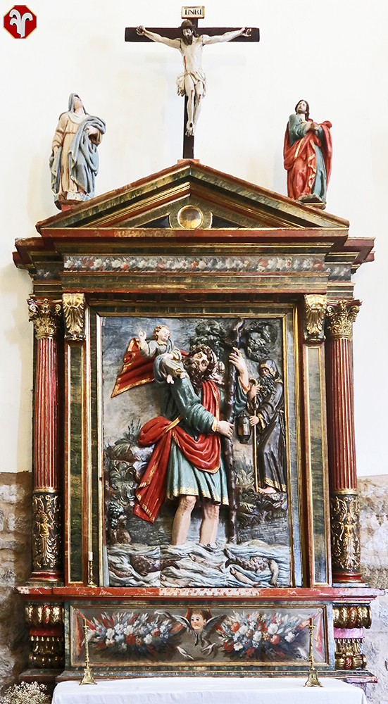 Retablo San Cristóbal, es decir el portador de Cristo, del siglo XVI. Se trata de una obra de grandes dimensiones en el que, en un armario muy clasicista de un solo cuerpo, se coloca en alto relieve la figura del patrono de la obra con el niño a cuestas atravesando un río caudaloso. Camina por el agua apoyado en el tronco de la palmera en el que se ha convertido su cayado para tener el sustento de los dátiles.